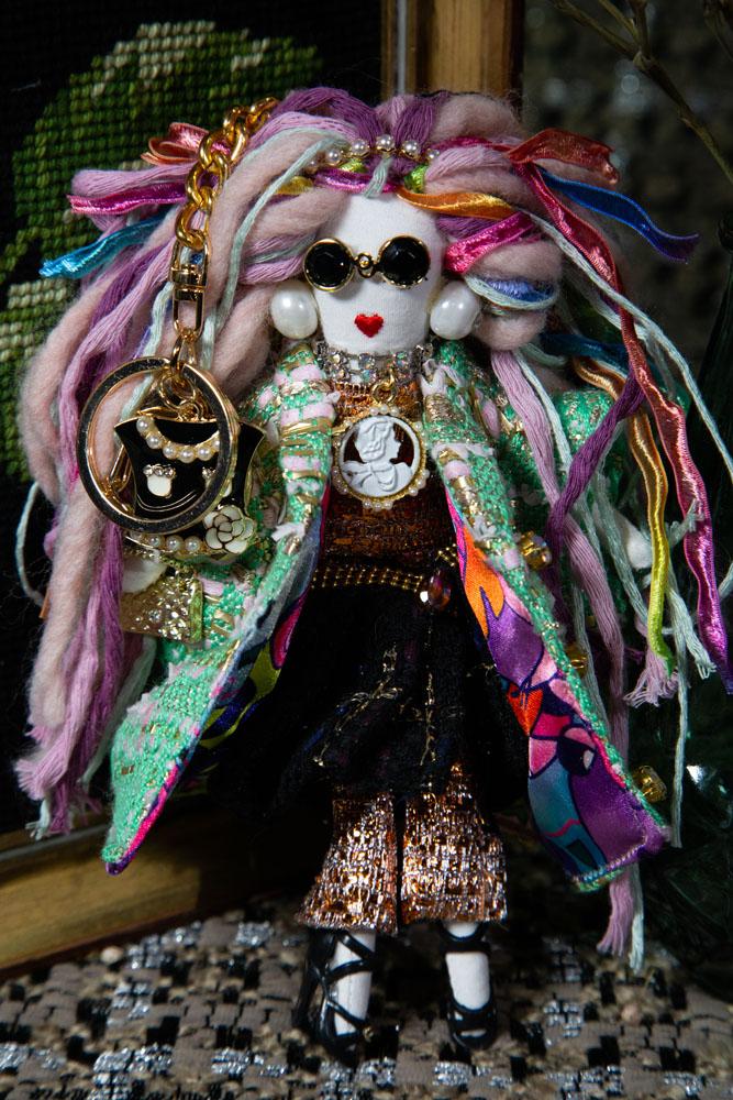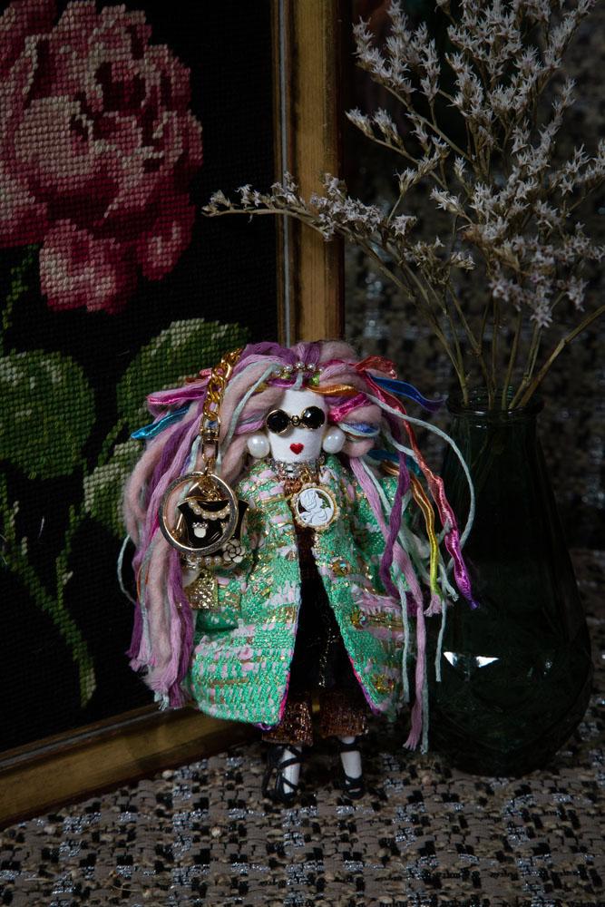 Un porte-clés Georgette fait à la main, avec des cheveux pastel en fils, un manteau vert scintillant, des perles et des charms au style vintage. Une pièce fantaisiste, élégante et empreinte de charme rétro.