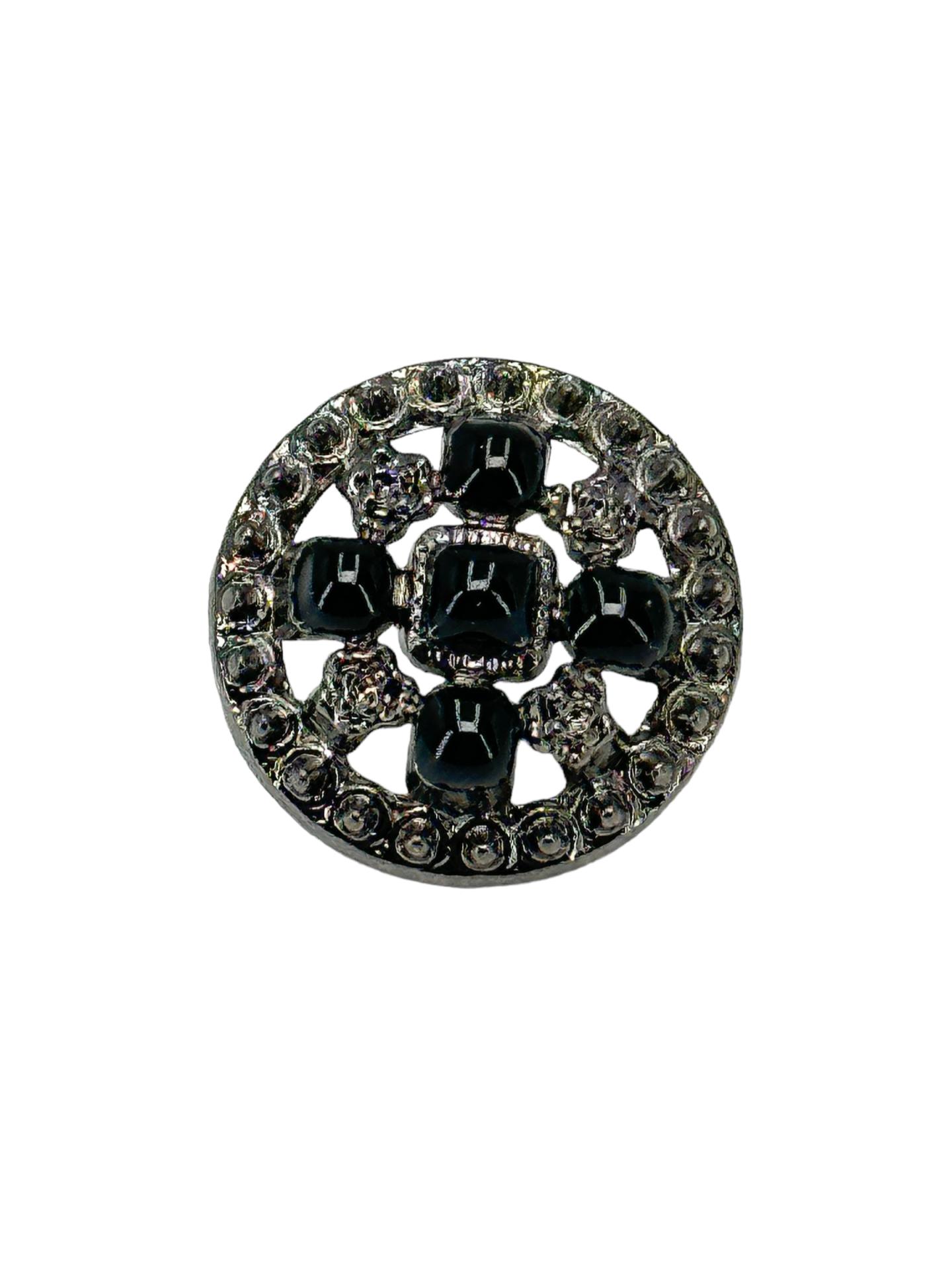 Opulent, spectaculaire et plein d'allure vintage, le grand bouton Renaissance donne vie à la grandeur de la Renaissance avec une touche de modernité. Doté de détails complexes, ce bouton présente des accents étincelants qui captent la lumière et rehaussent la riche base noire. Le contraste spectaculaire entre le noir et les éclats scintillants crée un effet saisissant et luxueux, faisant de ce bouton une pièce d'apparat parfaite pour n'importe quel vêtement ou accessoire.