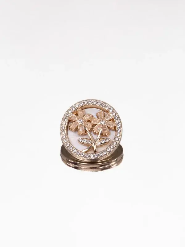 Un bouton rond raffiné présentant un délicat motif de branche de laurier, encadré de strass scintillants sur une base dorée douce. Élégant et intemporel.