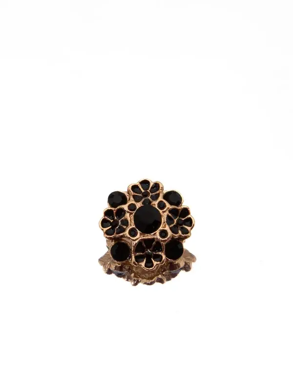 Un bouton de style vintage orné de cristaux noirs de jais disposés en un motif floral audacieux, élégant et empreint d'un romantisme sombre.
