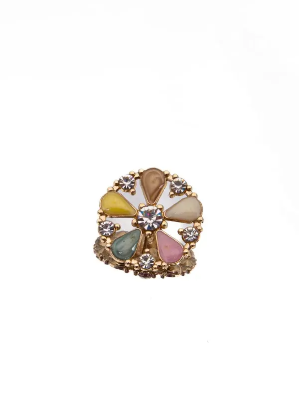 Un bouton doux et ludique composé de segments en émail pastel disposés comme un moulin à vent, agrémentés d’accents en cristal et encadrés d’un contour doré.