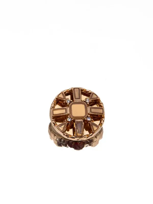 Un bouton rond sculpté orné d'un motif géométrique en croix, rehaussé de pierres précieuses baguette aux tons bronze chaud et de détails métalliques profonds, riche, structuré et raffiné.
