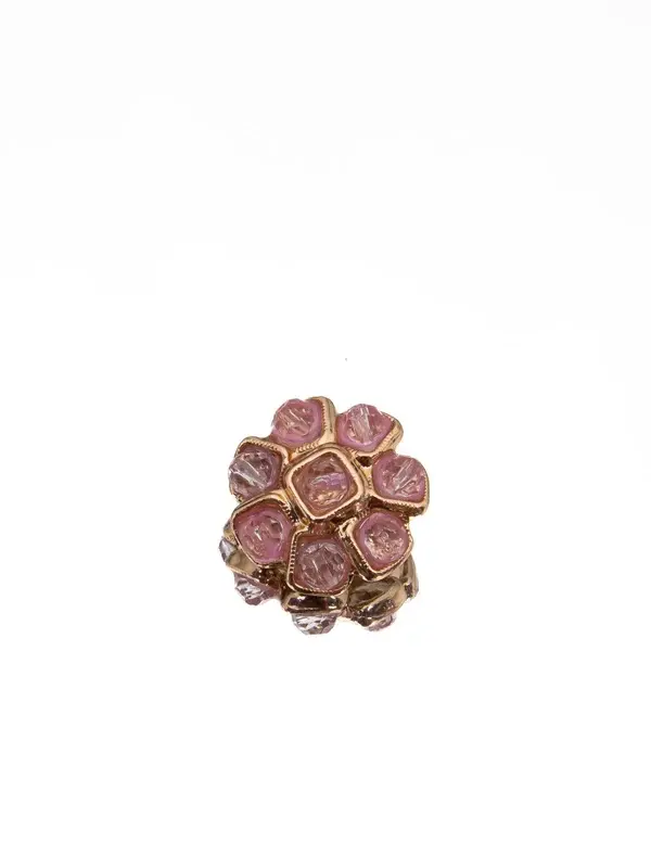 Un bouton romantique en forme de dôme, orné d’un ensemble de cristaux rose poudré sertis dans des montures dorées. Féminin, floral et plein d’éclat.