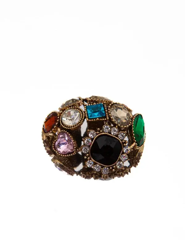 Un bouton audacieux et éclectique présentant une mosaïque de faux gemmes multicolores serties dans un or antique. Riche, royal et irrésistiblement maximaliste.