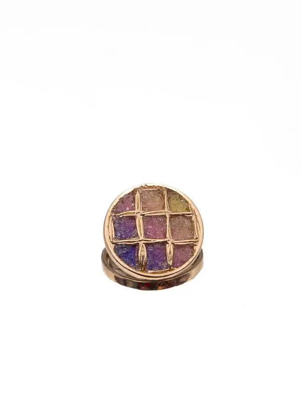 Un bouton décoratif rond orné d'un motif en treillis doré sur une base en émail irisé scintillant, ludique, moderne et aux couleurs changeantes.