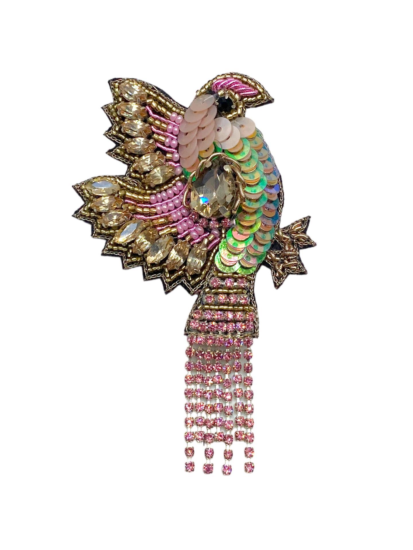 Une broche en forme de colombe ornée de sequins pastel, de cristaux scintillants et de délicats détails drapés, idéale pour une élégance douce et poétique.