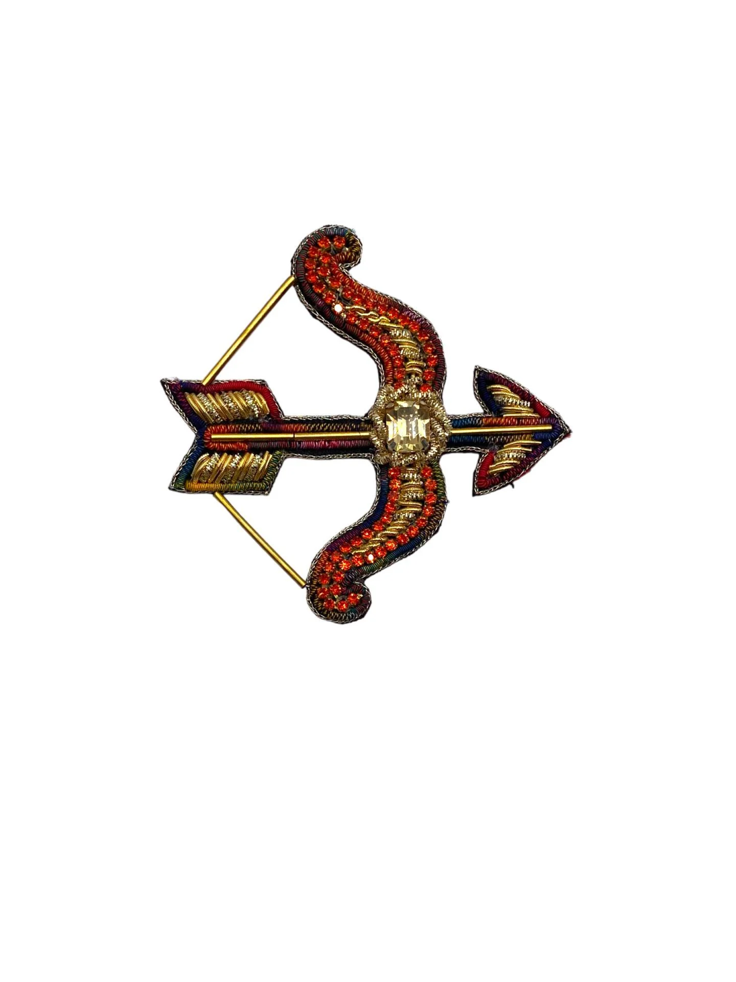 Une broche brodée audacieuse représentant un arc et une flèche aux tons multicolores pour une allure symbolique et affirmée.