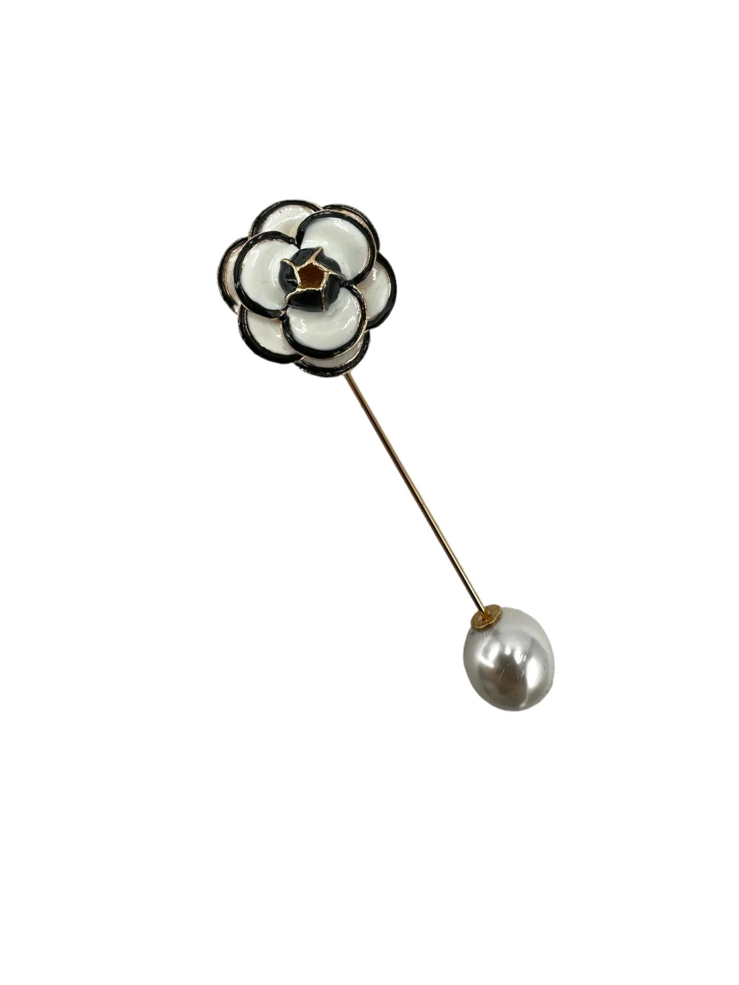 Une broche épingle fleur délicate aux pétales blancs, ornée d’une perle suspendue pour une élégance moderne.