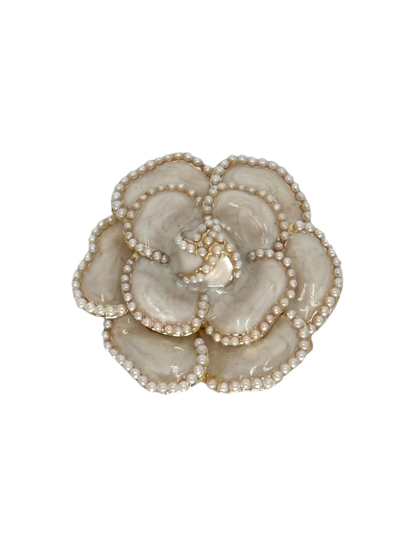 Une broche fleur élégante aux pétales blancs délicatement soulignés de petites perles pour une allure douce et raffinée.