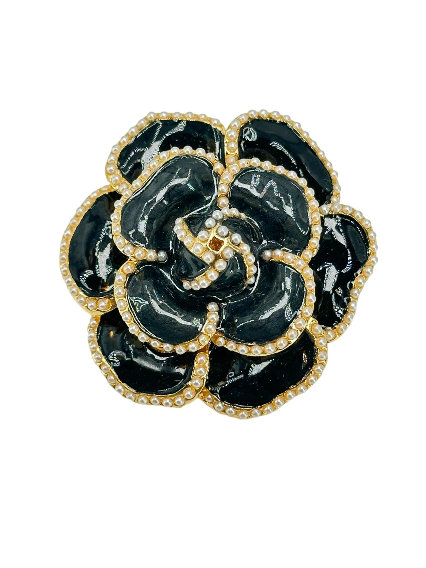 Une broche fleur audacieuse aux pétales noirs brillants, délicatement soulignés de perles pour une élégance raffinée.