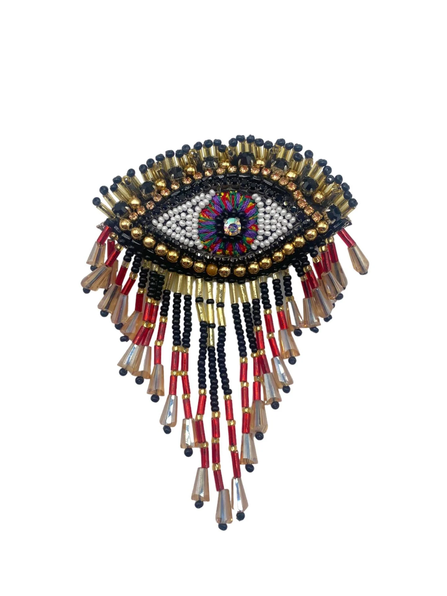 Une broche œil spectaculaire ornée de broderies de perles et de franges délicates. Un accessoire audacieux et symbolique pour sublimer vos tenues.