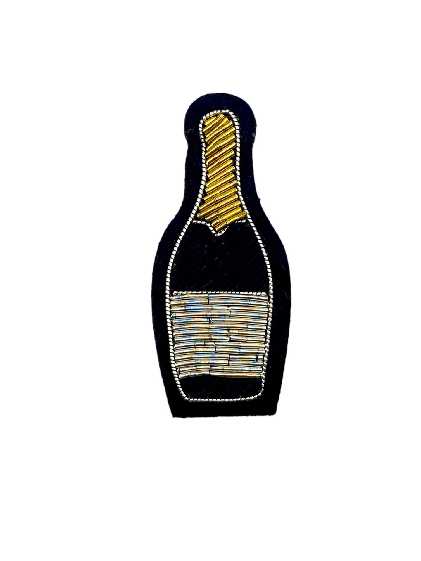 Une broche bouteille de champagne ornée de broderies de perles dorées et de détails métallisés. Une touche festive et élégante pour vos tenues et accessoires.