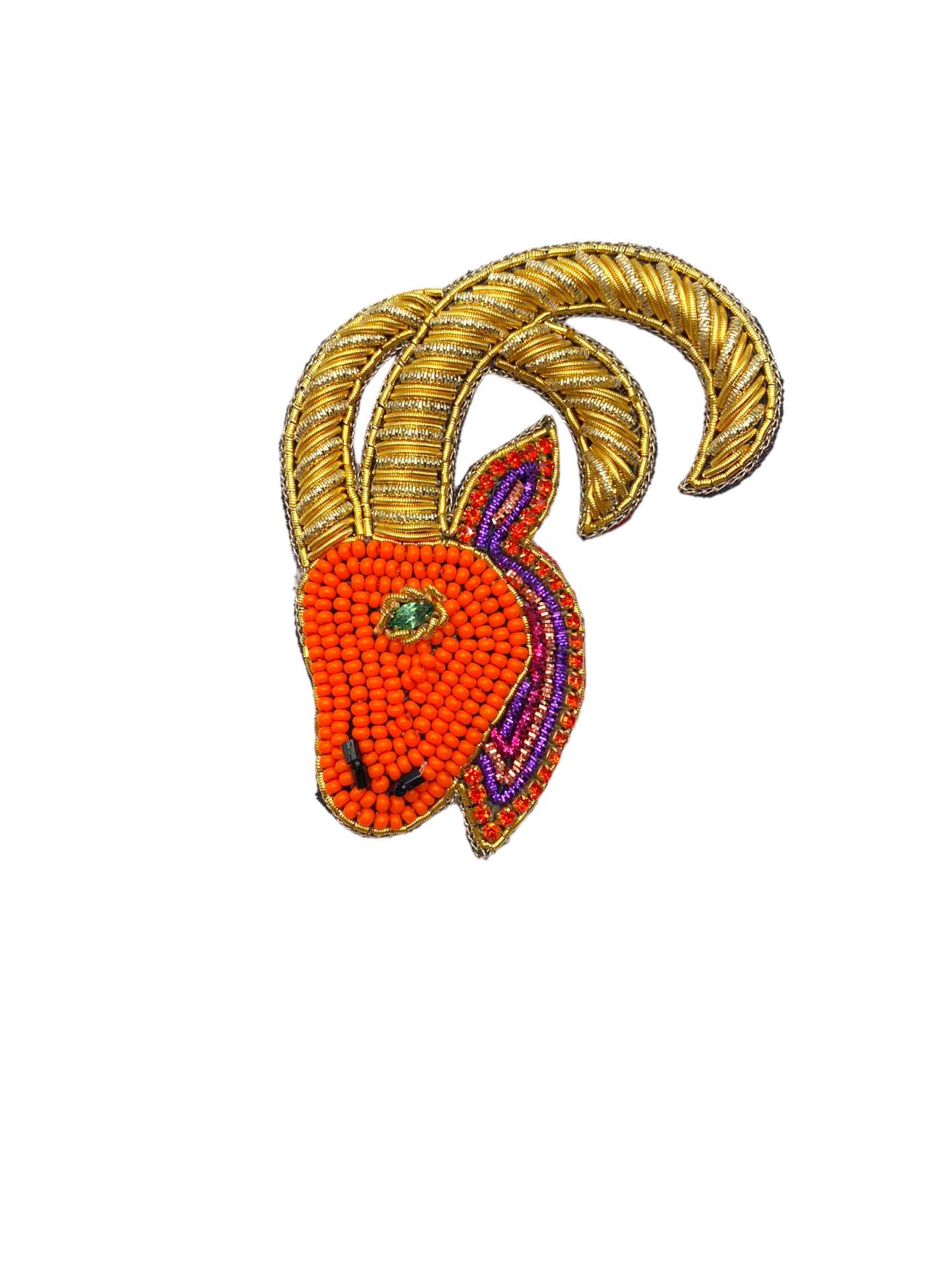 Une broche inspirée du Bélier, ornée de broderies de perles colorées et de cornes dorées sculptées. Un accessoire puissant et symbolique.