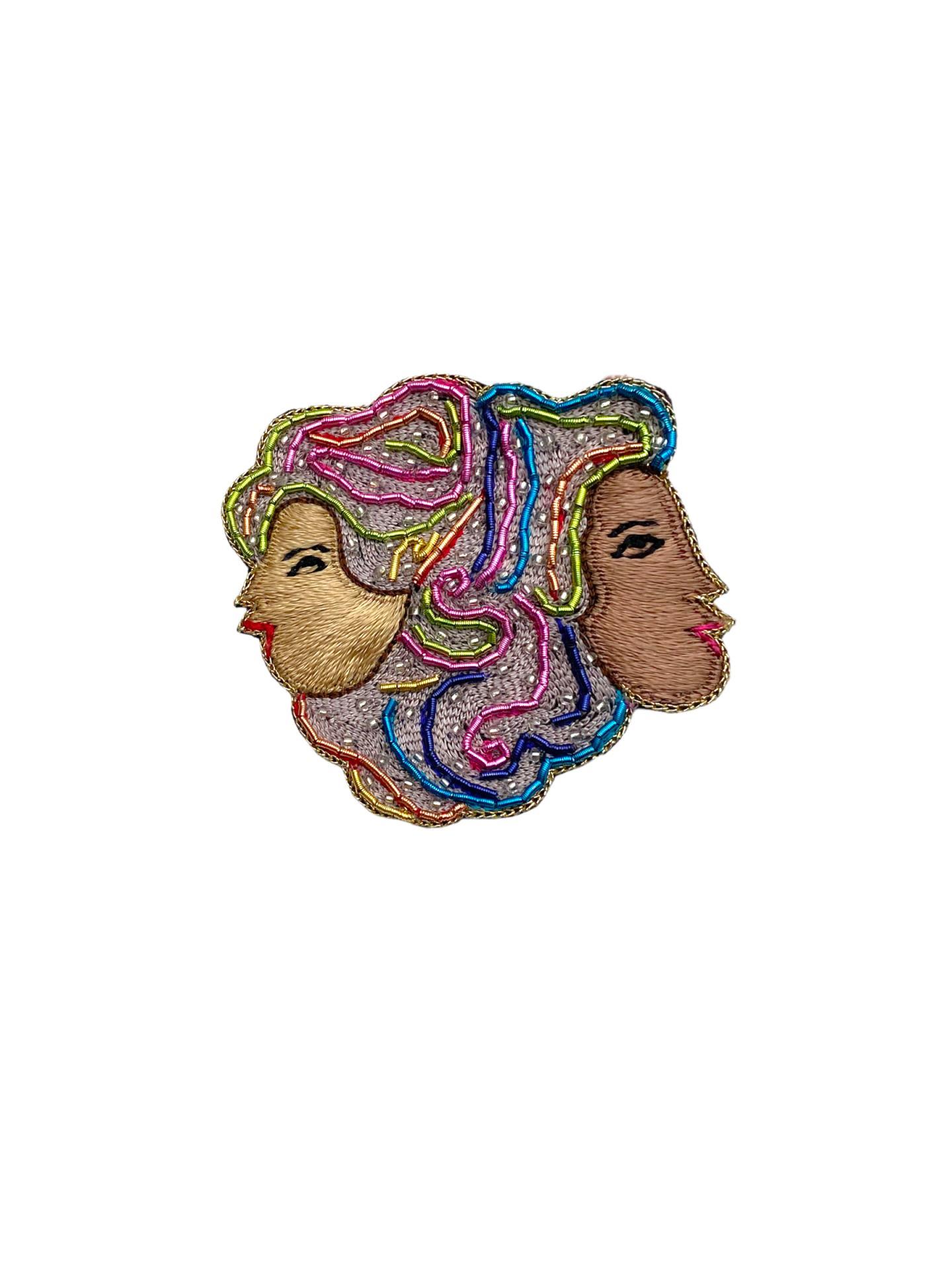 Une broche Gémeaux arc-en-ciel représentant deux visages ornés de broderies de perles colorées. Un accessoire astrologique expressif et artistique.