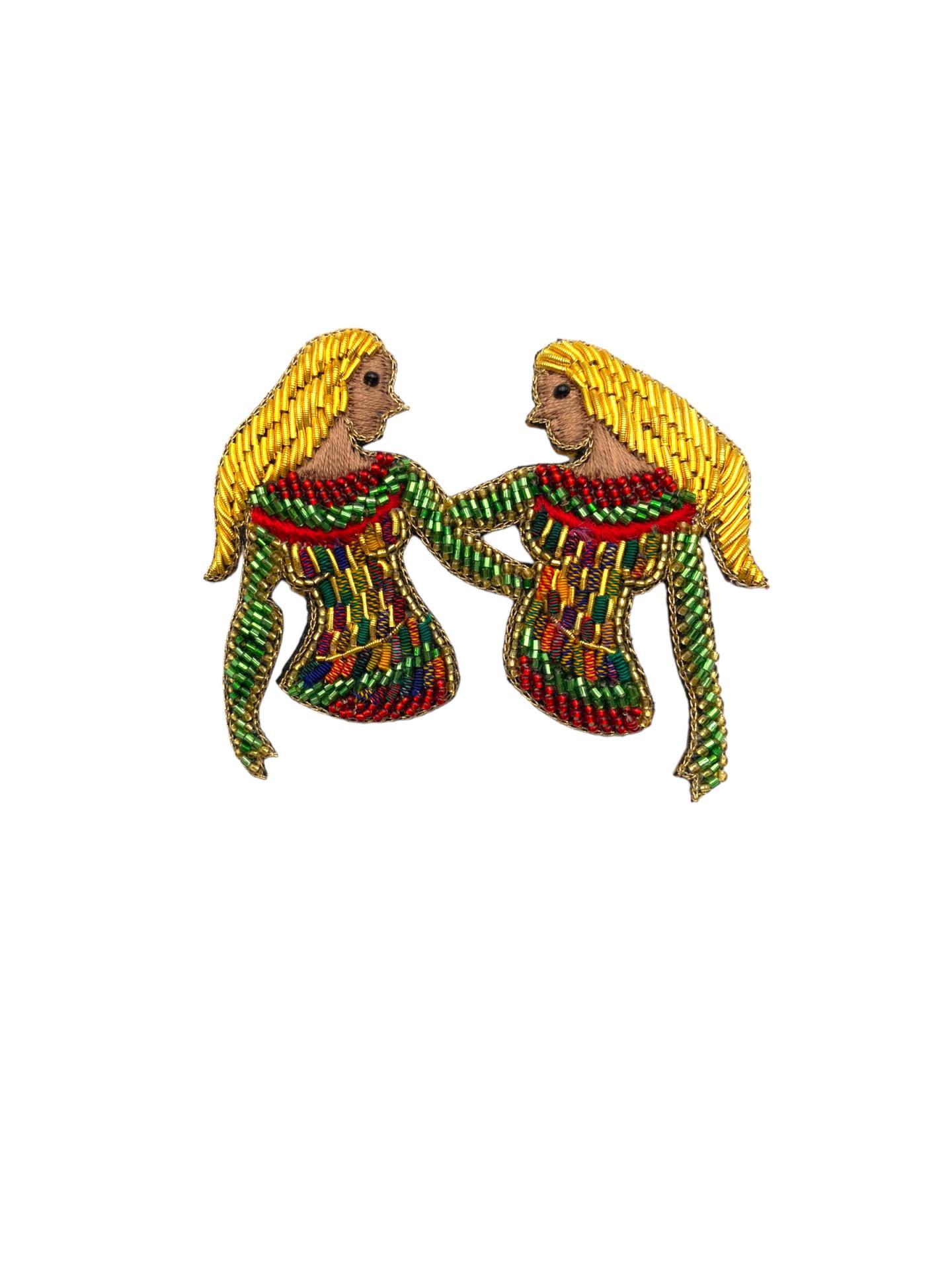 Une broche Gémeaux représentant des jumeaux ornés de broderies de perles colorées. Un accessoire astrologique expressif et symbolique.