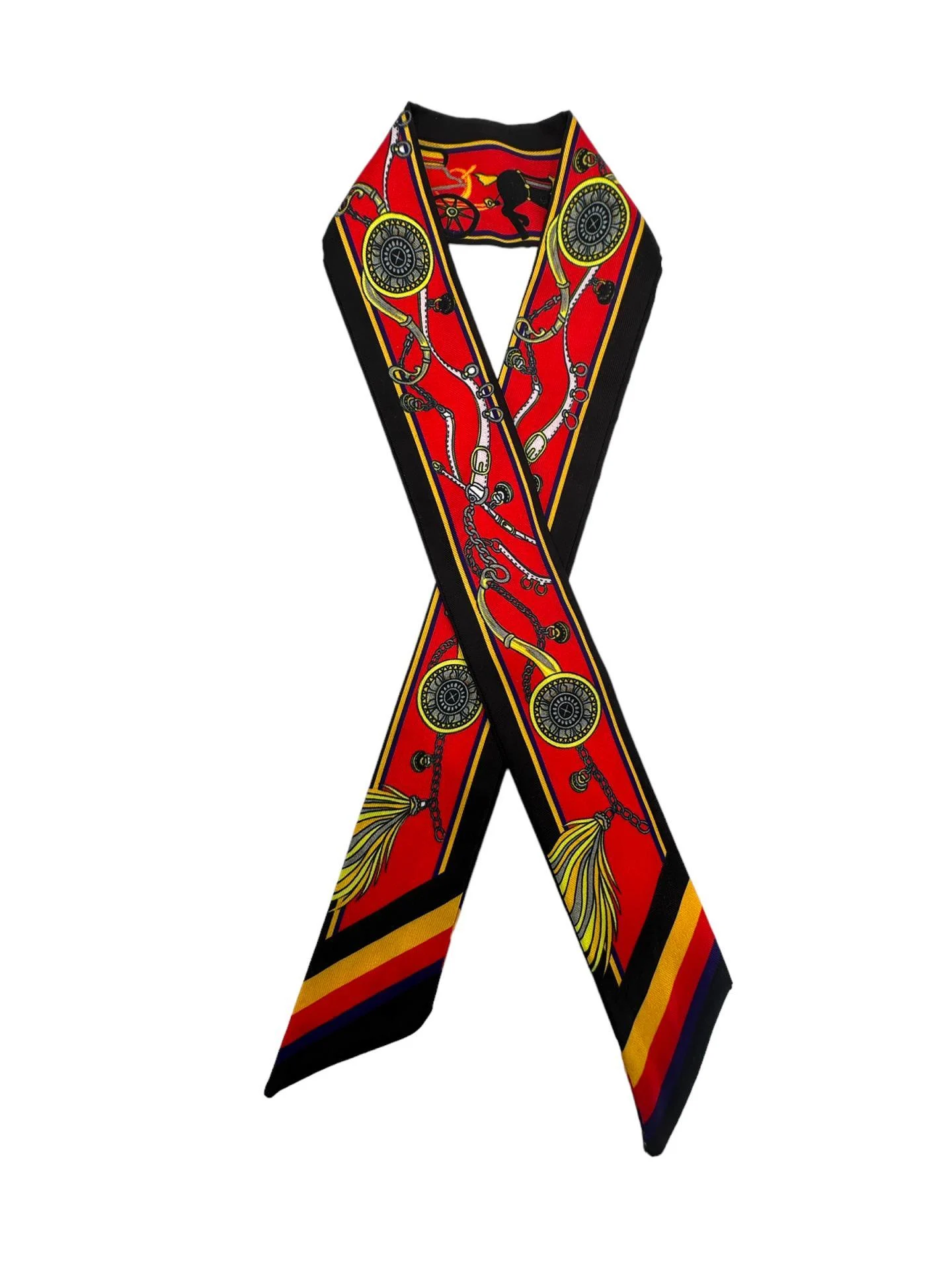Un foulard rouge intense orné de motifs classiques et de bordures graphiques, idéal pour apporter une élégance intemporelle à vos tenues.