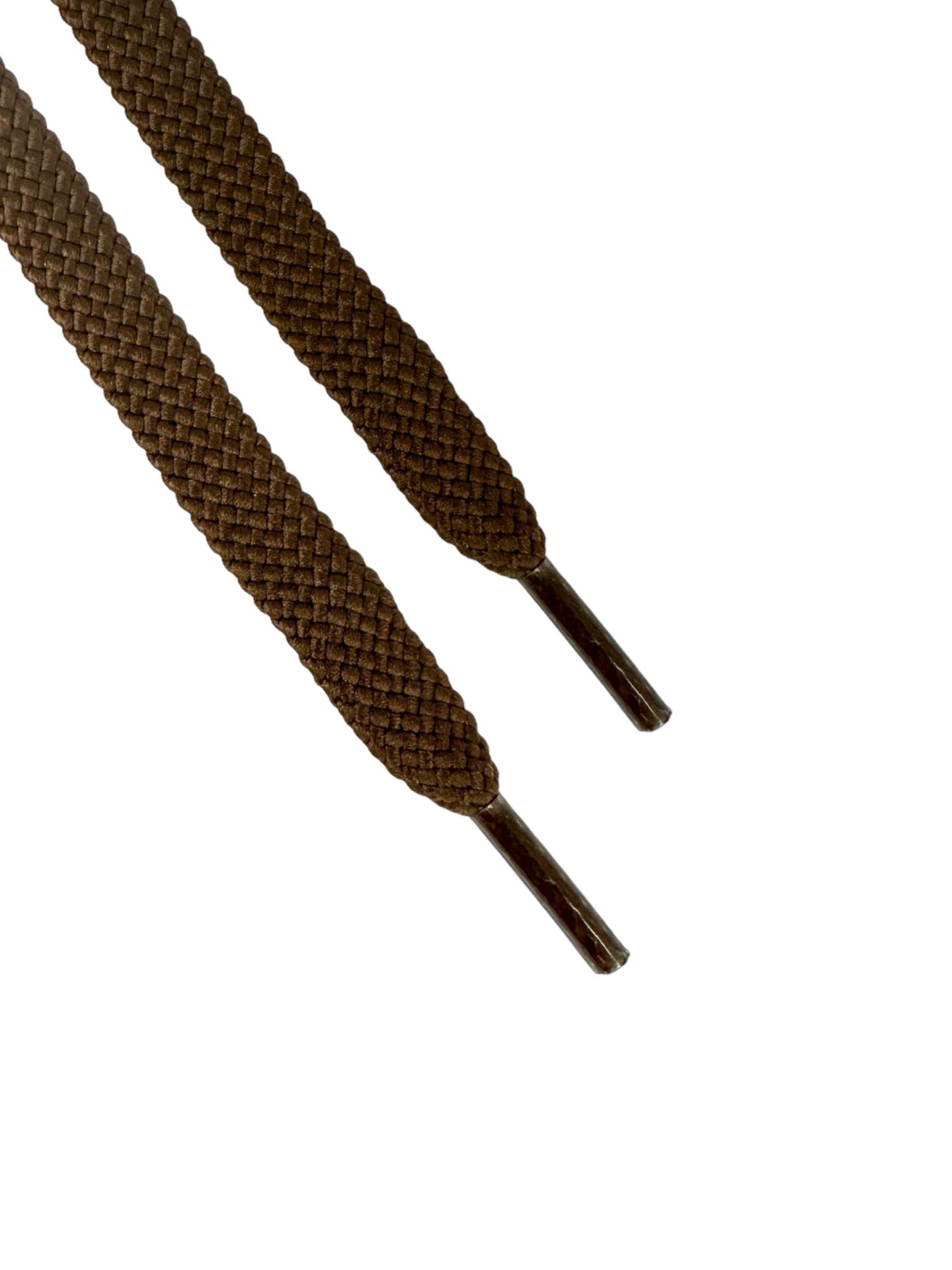 Lacets plats marron foncé avec extrémités en tissu cousues ou scellées à chaud (sans métal)