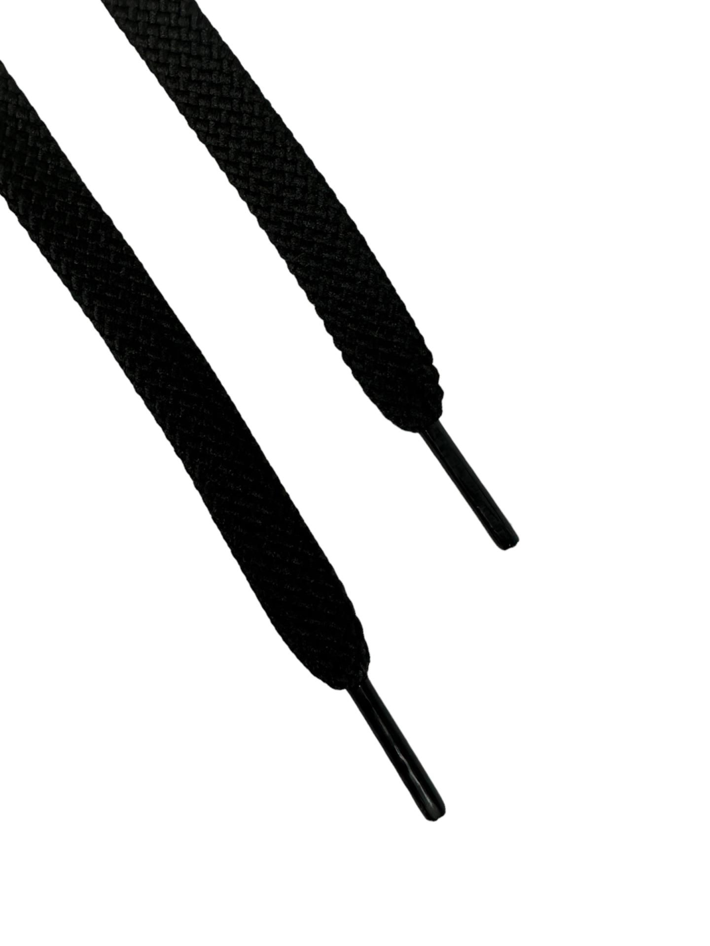 Lacets noirs plats avec embouts en tissu cousus ou thermosoudés (pas de métal)