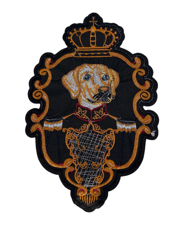 L'écusson Royal Retriever, un emblème richement brodé représentant un golden retriever vêtu d'une tenue royale et encadré d'un blason orné, rehausse votre look d'un luxe loyal. Surmonté d'une couronne rouge et d'ornements héraldiques, cet écusson est parfait pour les amoureux des chiens qui ont le goût de la grandeur classique.