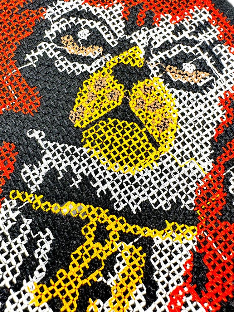 Épagneul brodé avec un contraste audacieux entre le rouge et le blanc