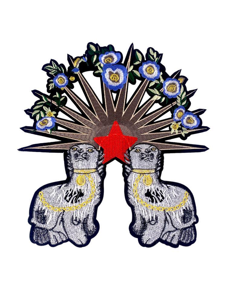 Patch brodé orné de deux chiens protecteurs symétriques sous des rayons lumineux, des fleurs bleues et une étoile rouge centrale.
