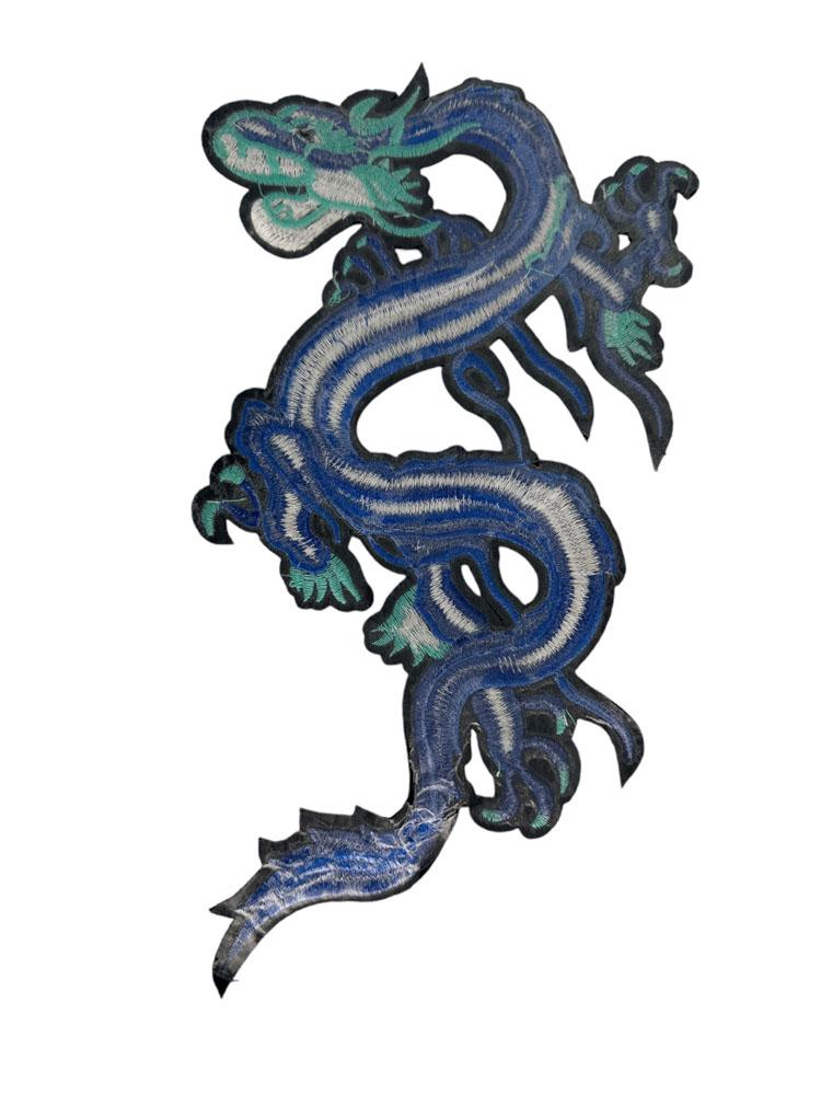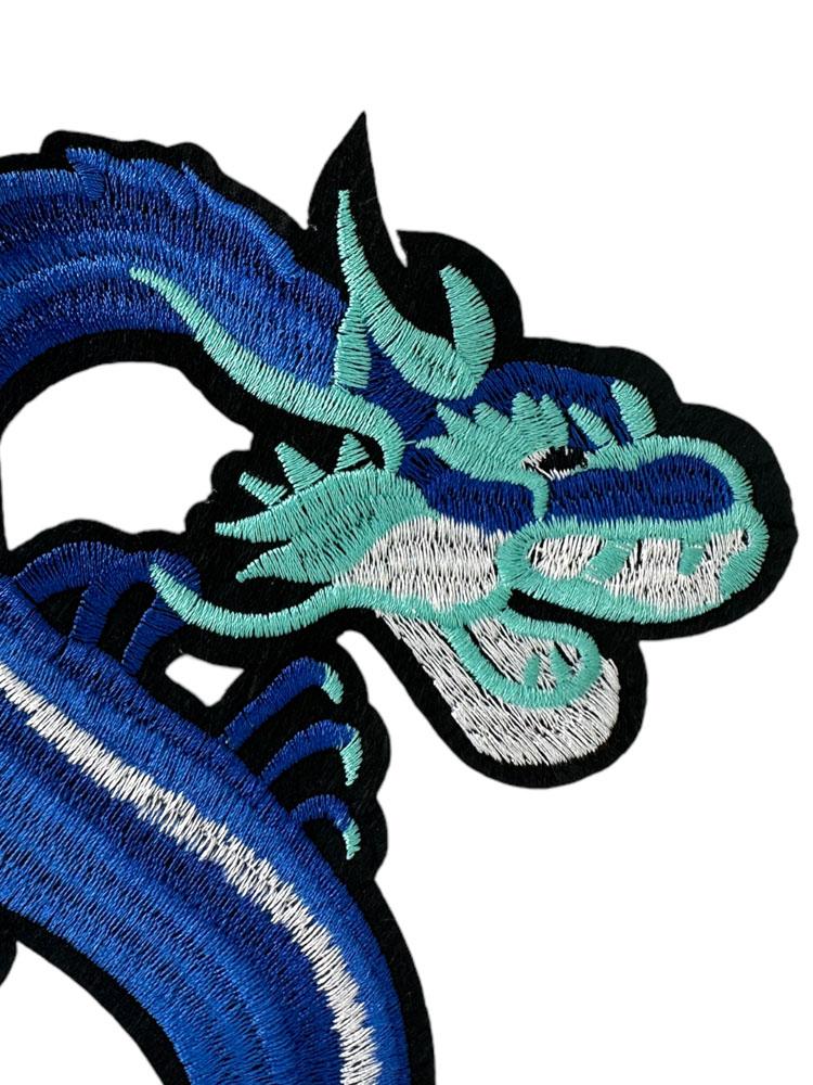 Écusson brodé représentant un dragon bleu de style oriental au vol serpentin