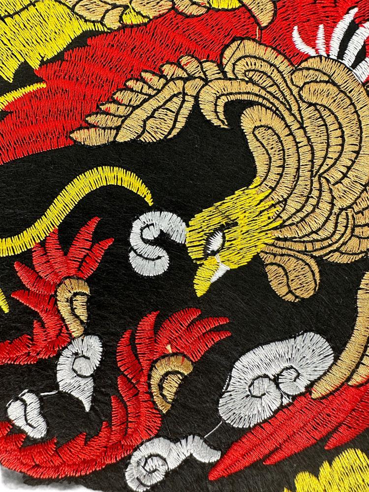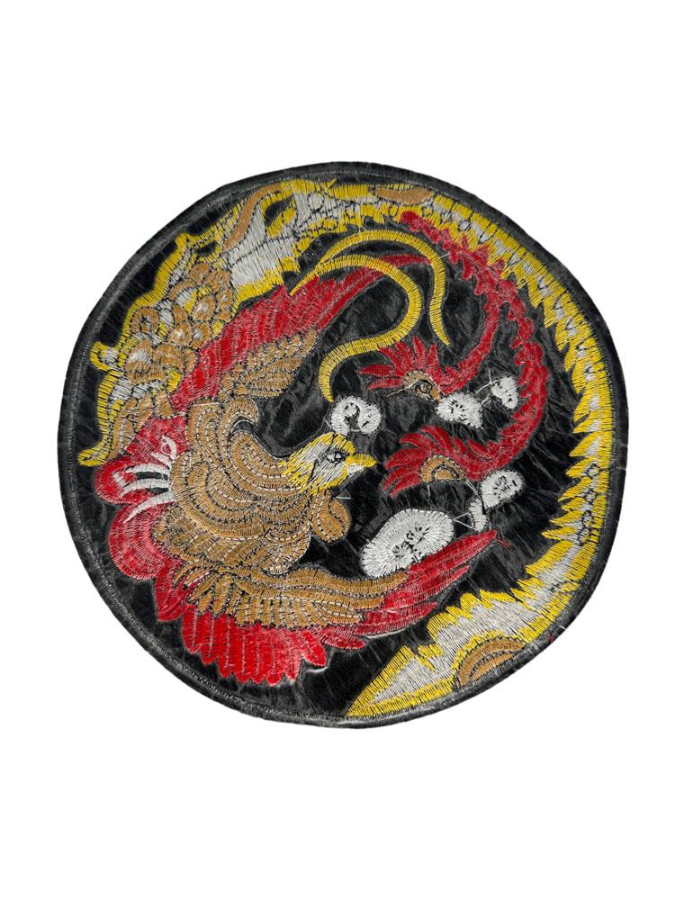 Écusson rond brodé représentant un dragon enroulé et un phénix en vol