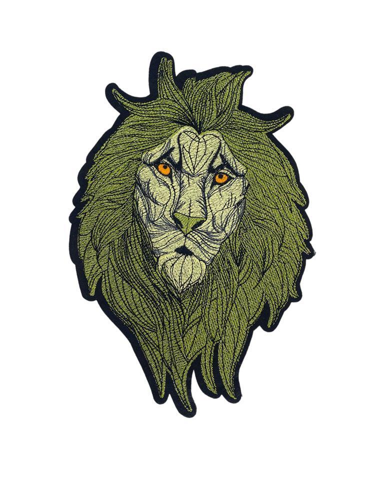 Patch brodé représentant un lion majestueux à la crinière feuillue dans des tons forestiers.