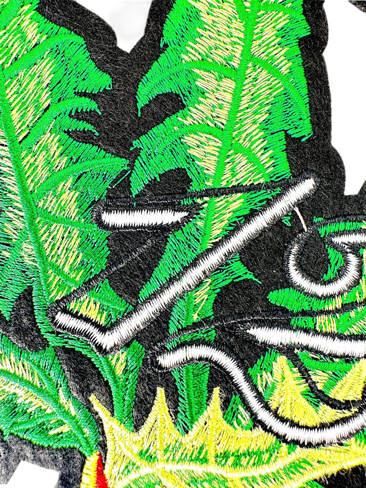 Écusson brodé représentant des pissenlits, des feuilles et la citation "La vie est une question d'exploration".