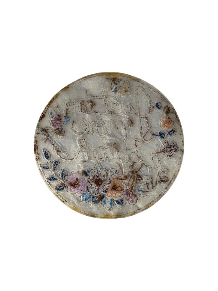 Entouré de notions brodées : fil, aiguille, boutons, fleurs