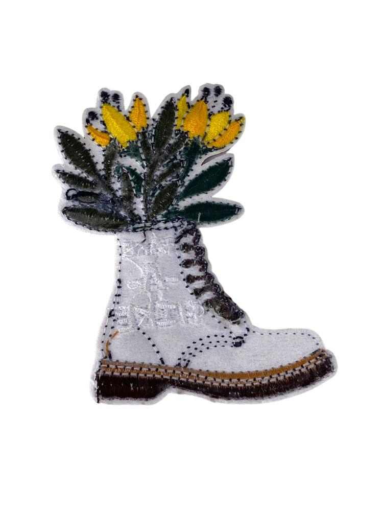 Écusson brodé représentant une botte de randonnée avec des fleurs jaunes et du texte