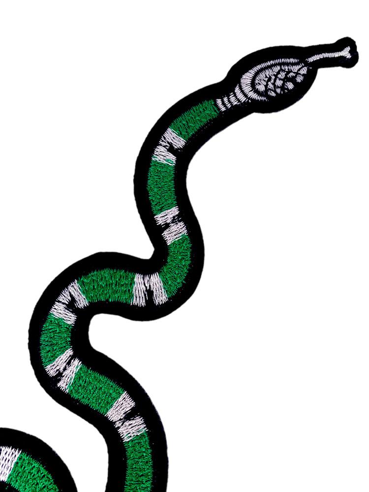 Écusson brodé représentant un serpent vert enroulé avec des marques blanches.