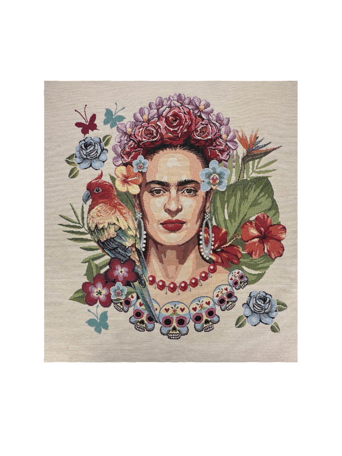 Le Tissu Tapisserie de Jardin Frida rend hommage à l'une des muses les plus emblématiques de l'histoire de l'art. Au centre se trouve un puissant portrait féminin orné d'une couronne florale et entouré de feuillages tropicaux luxuriants, de fleurs vives, de papillons et de crânes symboliques—évoquant des thèmes de résilience, de beauté et d'identité culturelle. Ce design richement illustré est une déclaration dans tous les sens.