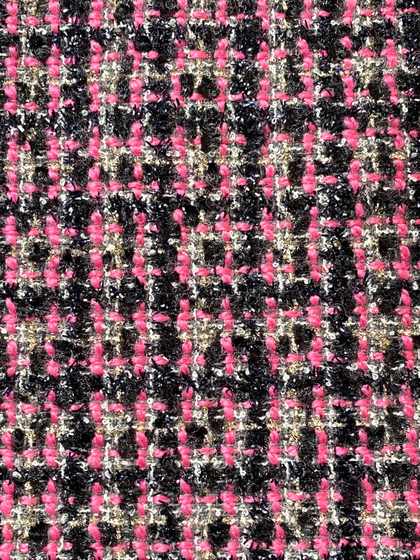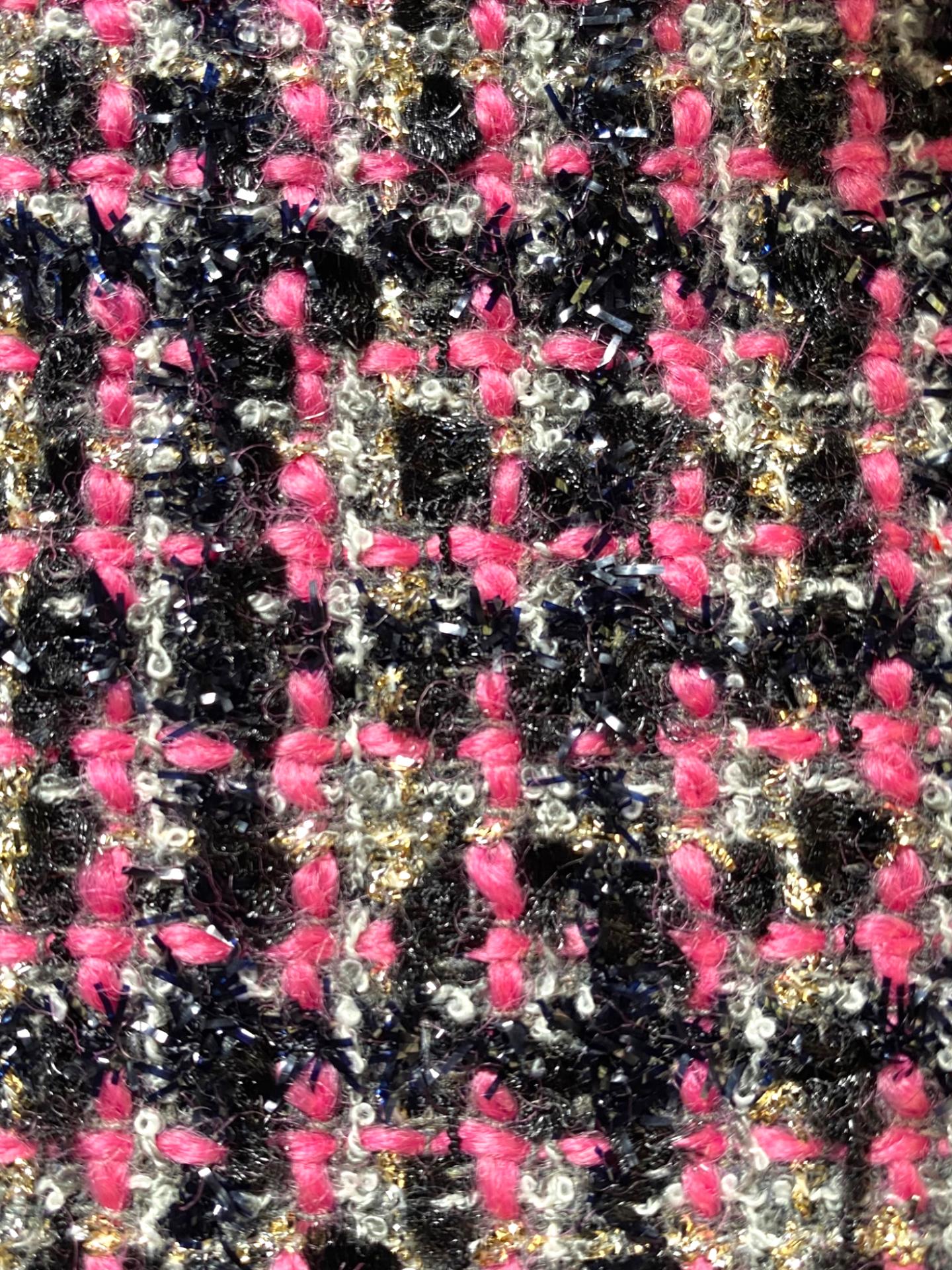 Tissu Tweed Tissé en Rose Fluo, Noir et Accents Métalliques