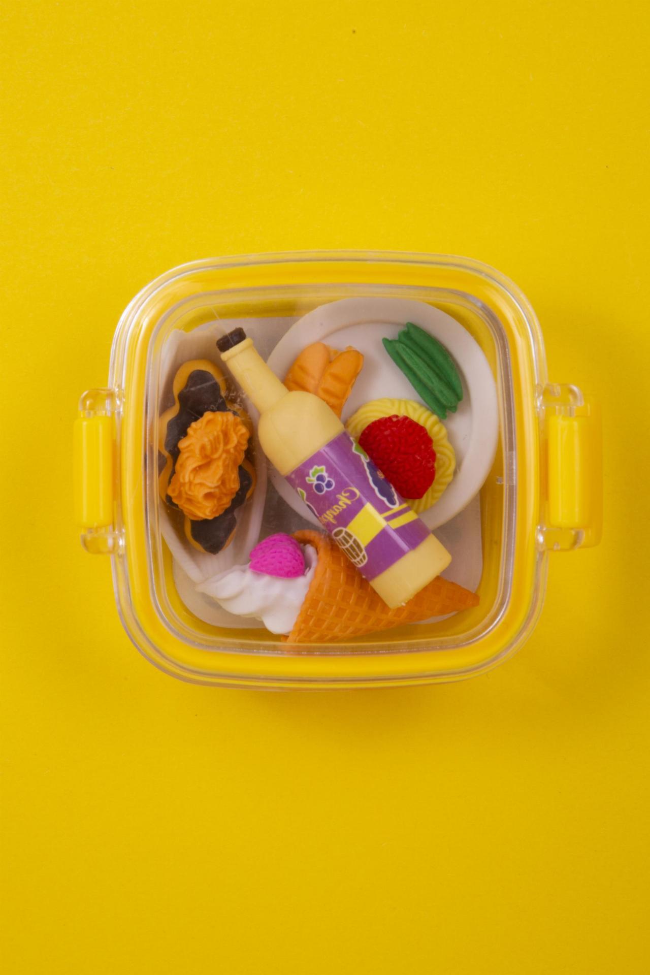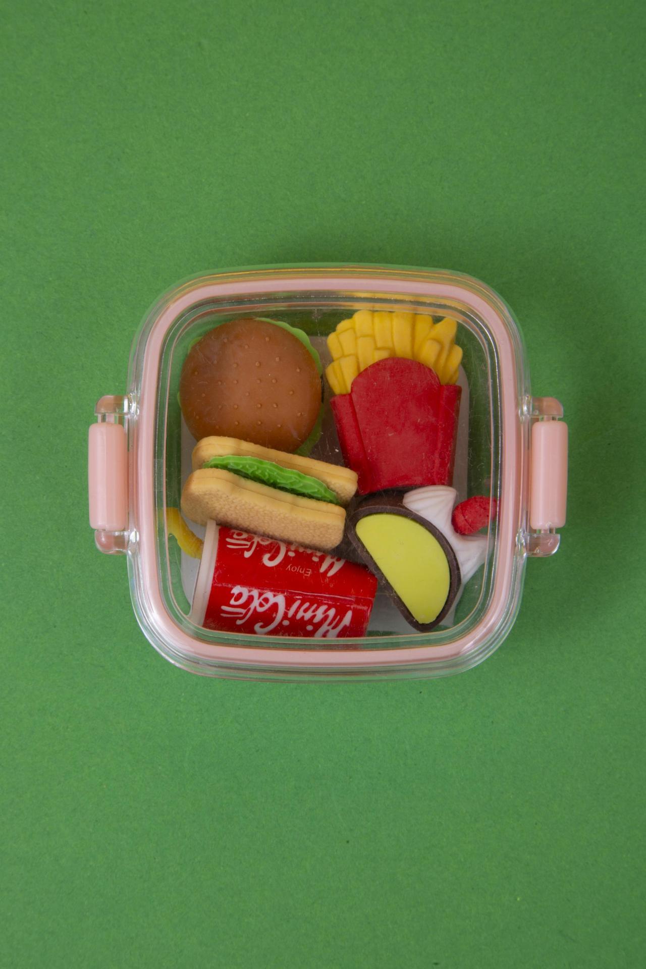 Un ensemble ludique de gommes en forme de repas: frites, burger, sandwich, boisson et petites douceurs, idéal pour l’école, le journaling et les fans de papeterie kawaii. Bon apétit!