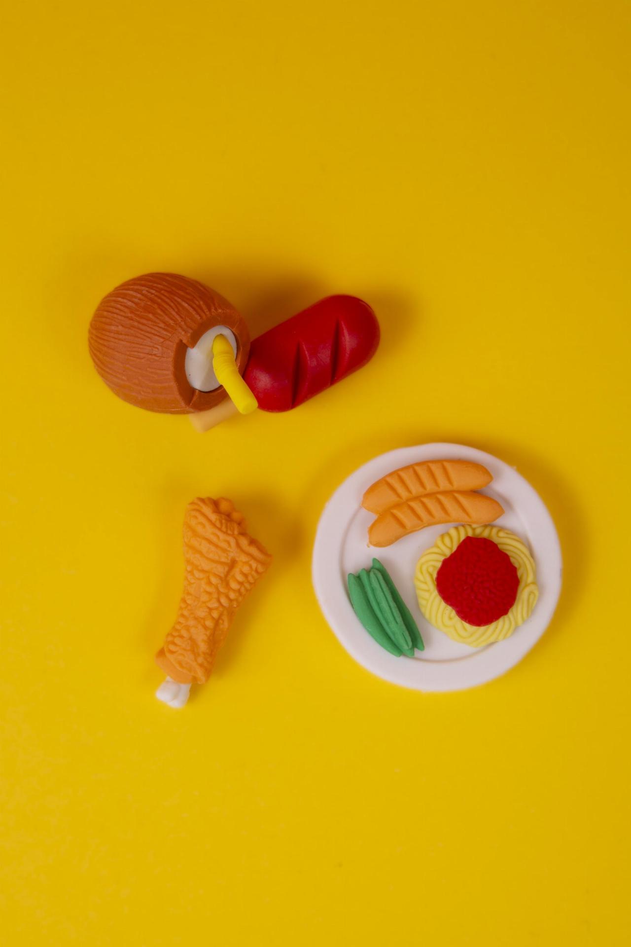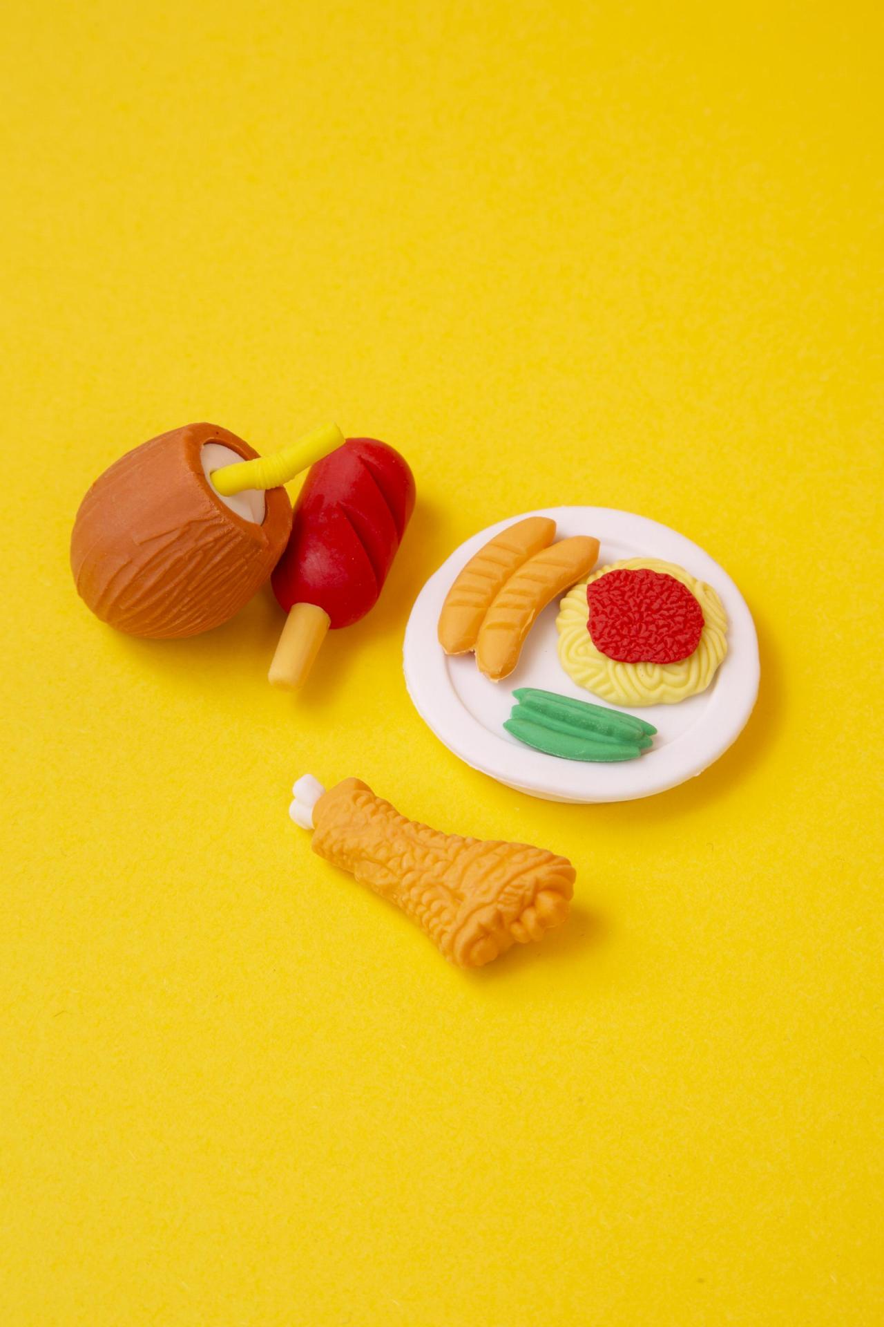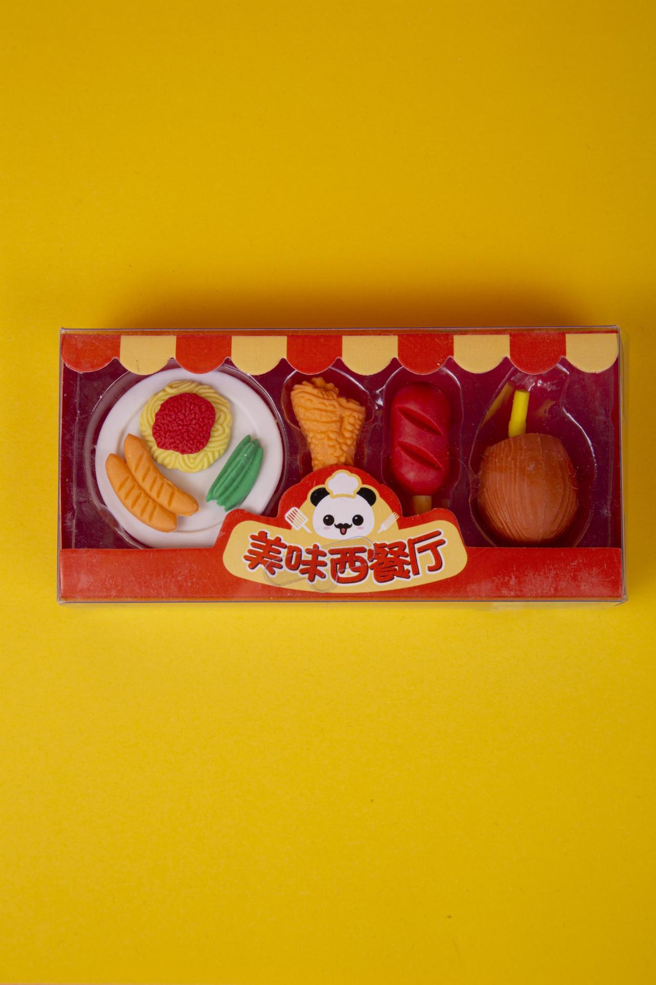 Un set de gommes inspiré d’un déjeuner gourmand : assiette de pâtes, saucisses, légumes et pilon de poulet, parfait pour l’école, le journaling et les fans de papeterie fun.