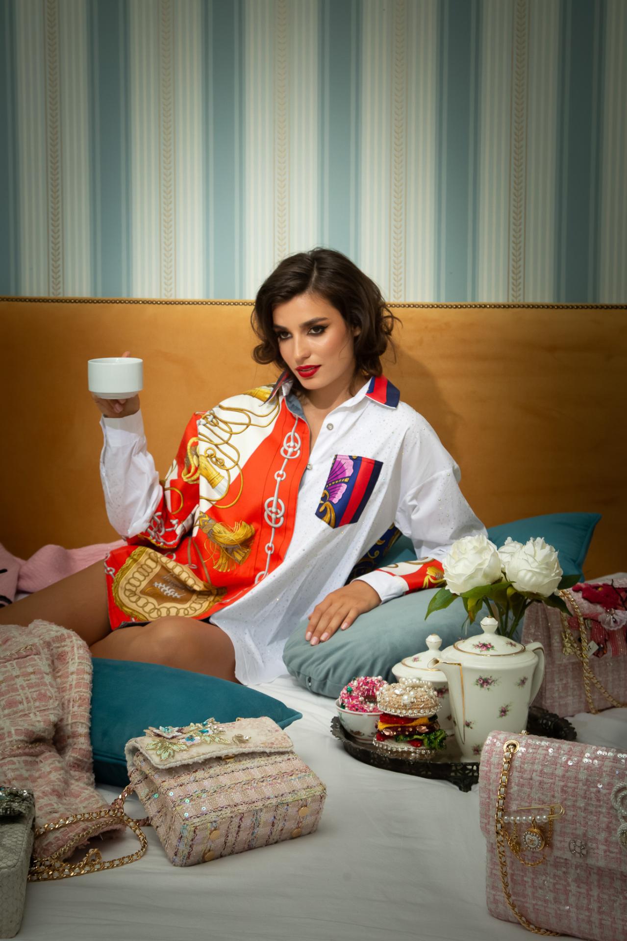 Une chemise blanche audacieuse, sublimée par des panneaux de foulards en soie rouge, or et bleu...