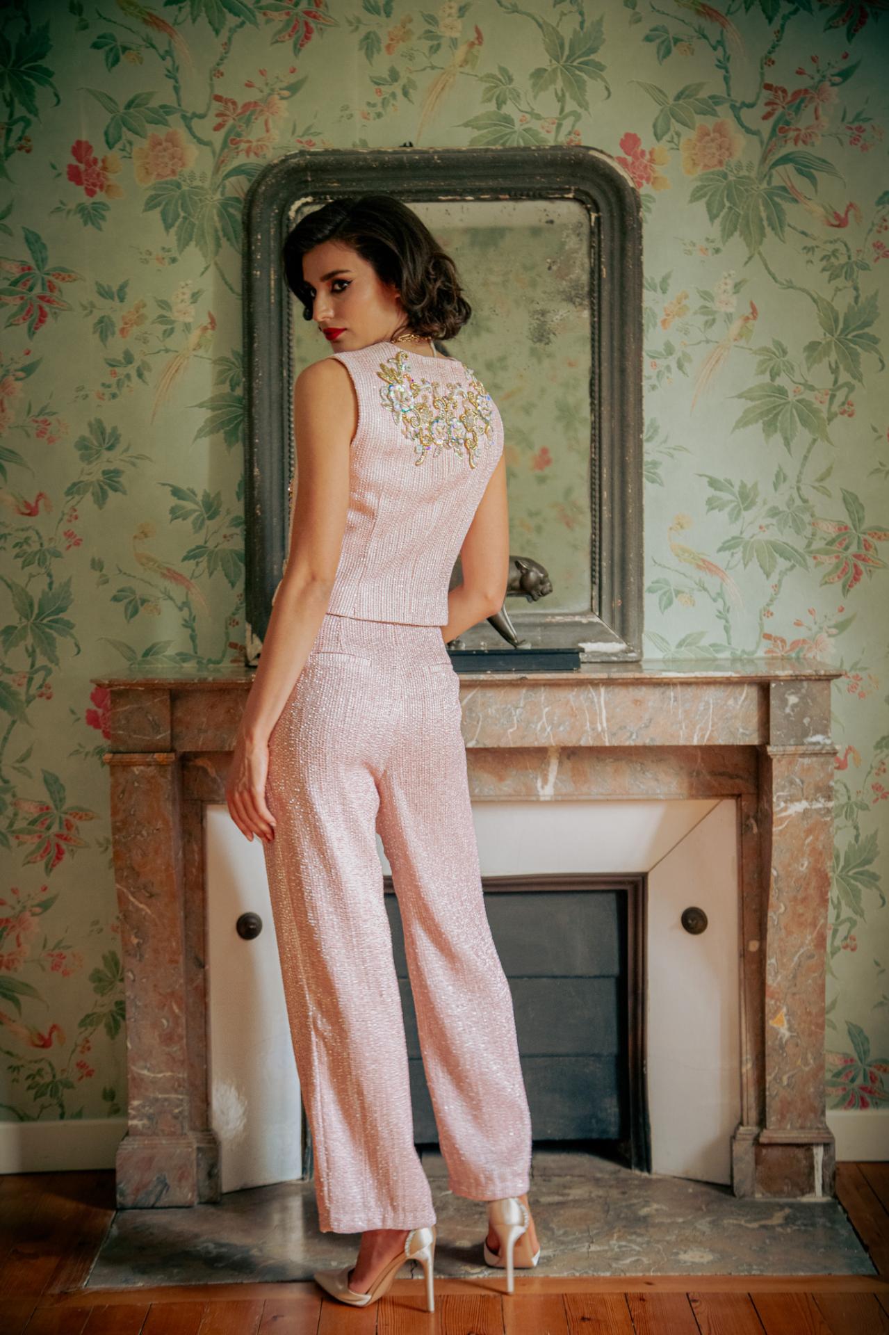 Le pantalon adopte une coupe droite, offrant une allure à la fois élégante et décontractée. Sa taille haute met en valeur la silhouette, et son tweed rose scintillant fait écho à celui du gilet pour créer un ensemble parfaitement harmonieux. Des broderies similaires à celles du gilet sont appliquées sur le haut du pantalon, notamment autour des poches, renforçant la cohésion et l’opulence de l’ensemble.