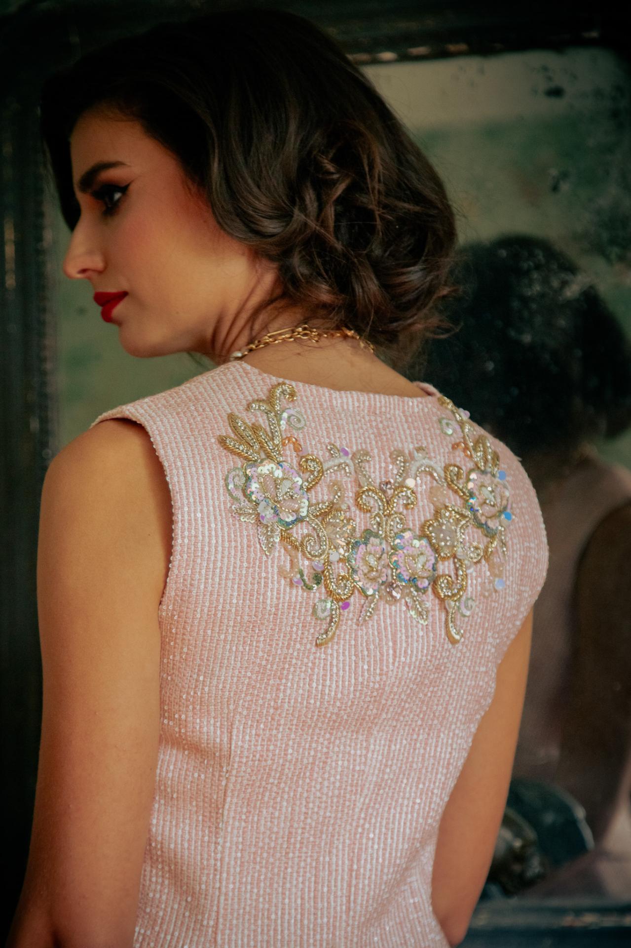 La tenue présentée sur la photo est un ensemble deux pièces raffiné et élégant, confectionné dans un tweed rose scintillant. Il se compose d’un gilet sans manches et d’un pantalon taille haute, tous deux embellis de broderies délicates ornées de strass et de sequins, apportant une touche luxueuse et sophistiquée.