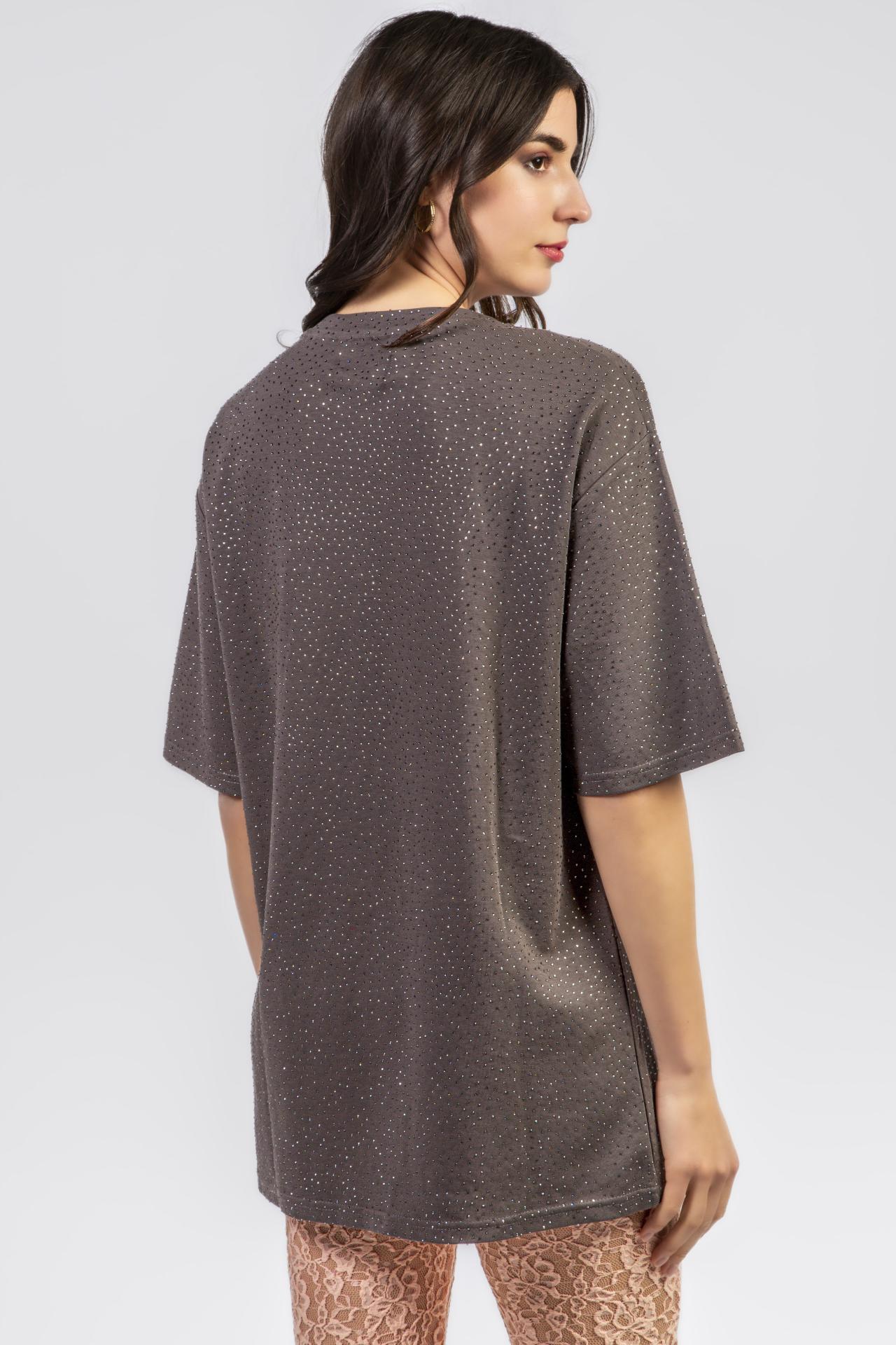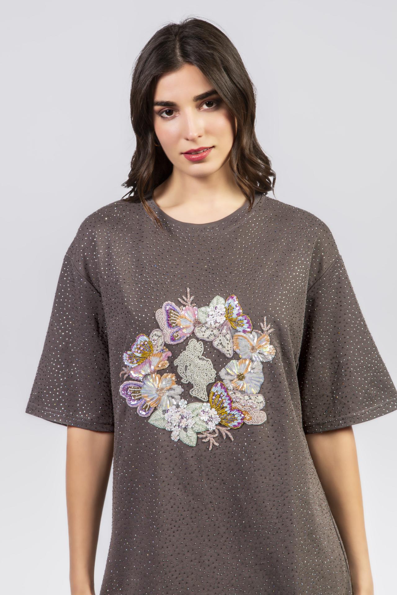 T-shirt moka coupe ample, parsemé de micro-cristaux et orné d’une couronne de papillons brodés aux nuances pastel.