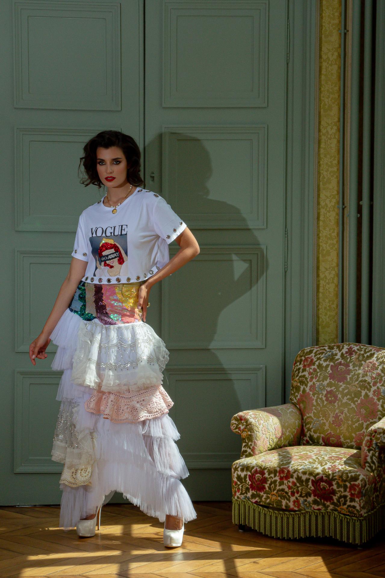 Un crop top blanc avec un motif graphique et des œillets métalliques.